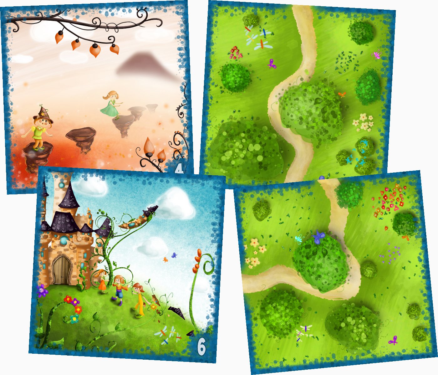 Dwustronnie drukowane kafle, z jednej strony z rysunkami zadań do wykonania, a z drugiej z fragmentem drogi, służą do ułożenia ścieżki przygód. Aby były odporne na częste użytkowanie przez dzieci, wykonane są z wytrzymałych ale jednocześnie lekkich płyt spienionego PVC gr. 5mm, z bardzo trwałym nadrukiem, posiadającym atesty na użytkowanie przez dzieci.