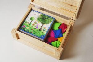 Wszystkie elementy gry są umieszczone w eleganckiej i solidnej drewnianej skrzyni.