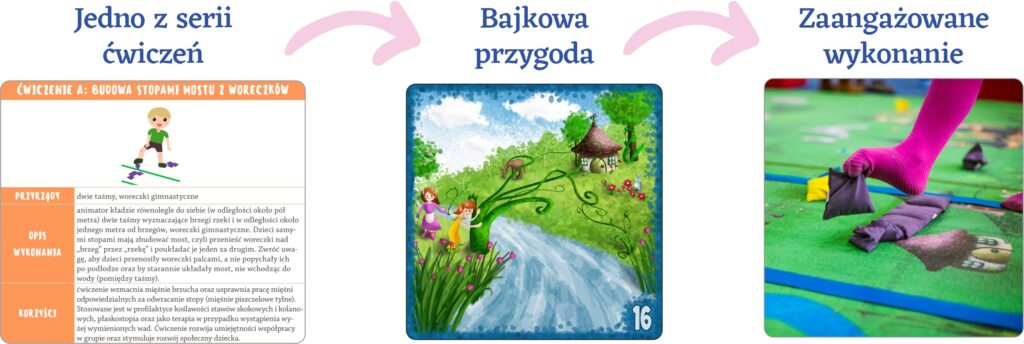Imagilandia w wyobraźni dzieci tworzy pasjonujące przygody w bajkowej krainie. Dlatego z ogromnym zaangażowaniem i starannością wykonują te „nudne”, ale bardzo konieczne, ćwiczenia ogólnorozwojowe i profilaktyczno korekcyjne, które zostały starannie dobrane przez dziecięcych fizjoterapeutów.